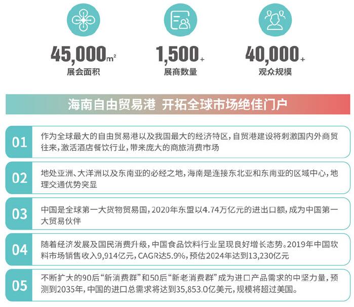 海南國際飲品博覽會,立基海南、面向全球,致力于為飲料及餐飲連鎖加盟企業(yè)進(jìn)駐海南自貿(mào)港,開拓在中國以及東盟市場的商貿(mào)業(yè)務(wù)。展會通過新品展示,資訊分享,趨勢洞察、資源對接的一站式服務(wù)為供求雙方搭建專業(yè)的商貿(mào)平臺,助力企業(yè)快速進(jìn)駐自貿(mào)港,搶占食飲新商機(jī)。