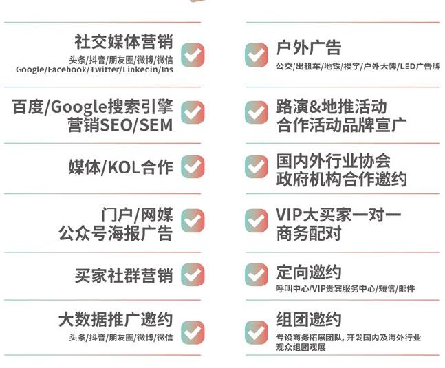 ▲全方位宣傳推廣,定向精準(zhǔn)邀約,商務(wù)配對服務(wù),最大化參展效益。